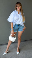 This Blue Striped Puff-Sleeve Blouse combines soft texture, breezy tailoring, and trend-right details—offering versatile styling across every look in your closet.