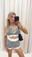 Stay on-trend with this summer-ready crochet set! The black and nude horizontal stripes create an eye-catching contrast, while the soft stretch fabric and scalloped hem bring a feminine, boho touch. Crafted for comfort and style, this matching crop tank and shorts combo is ideal for both relaxation and runway moments.