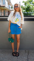 These vibrant ocean-blue fleece shorts blend plush comfort and everyday ease. Made from a medium-weight cotton-poly blend, they feature a drawstring waistband, side pockets, and edgy raw hem—bringing both coziness and cool to your seasonal wardrobe.