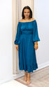 Radiate elegance in this stunning off-shoulder satin long dress. The luxurious, flowing fabric and flattering smocked waist create a beautifully draped silhouette that is sure to turn heads.
