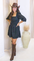 The square neckline, finished with a subtle front tie, frames the décolletage beautifully, while puff 3/4 sheer sleeves add volume and elegance. A fitted bodice with a smocked back panel ensures both comfort and shape, while the softly gathered mini skirt flows into an airy, flattering silhouette.