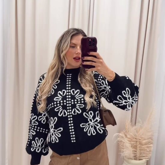 The ultimate cozy statement piece. This heavyweight knit sweater is designed in a super soft, ultra-stretchy fabric that’s as comfortable as it is stylish. Featuring a round neckline, exaggerated cuffs, and a relaxed loose fit, it drapes beautifully while keeping you warm. The bold black-and-white pattern gives it an effortlessly modern edge.