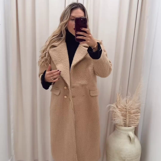 Wrap yourself in cozy chic with this medium-weight teddy coat. Designed with a notch collar and finished with gold button hardware, it’s the perfect mix of comfort and polish. The oversized silhouette makes it easy to layer, while side pockets add everyday practicality. A true statement outerwear piece that balances warmth with elevated style.