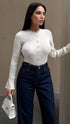 A timeless essential with a feminine twist — this white ribbed knit top is made in Turkey from a lightweight, super-stretchy fabric that feels as good as it looks. Designed for a flattering, flexible fit, it features small bell cuff sleeves and a delicate fake button detail down the front for a polished touch.