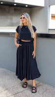 Effortlessly chic and versatile, the Zoe Two Piece Skirt Set in black is designed for both comfort and style. Made from a medium-weight crinkle gauze fabric, this matching set features a short sleeve crop top with a side slit and a high-waisted pull-over skirt with a wide elastic waistband for an easy, flattering fit. The skirt is pleated with a short inner lining, adding movement and comfort while keeping the look polished.